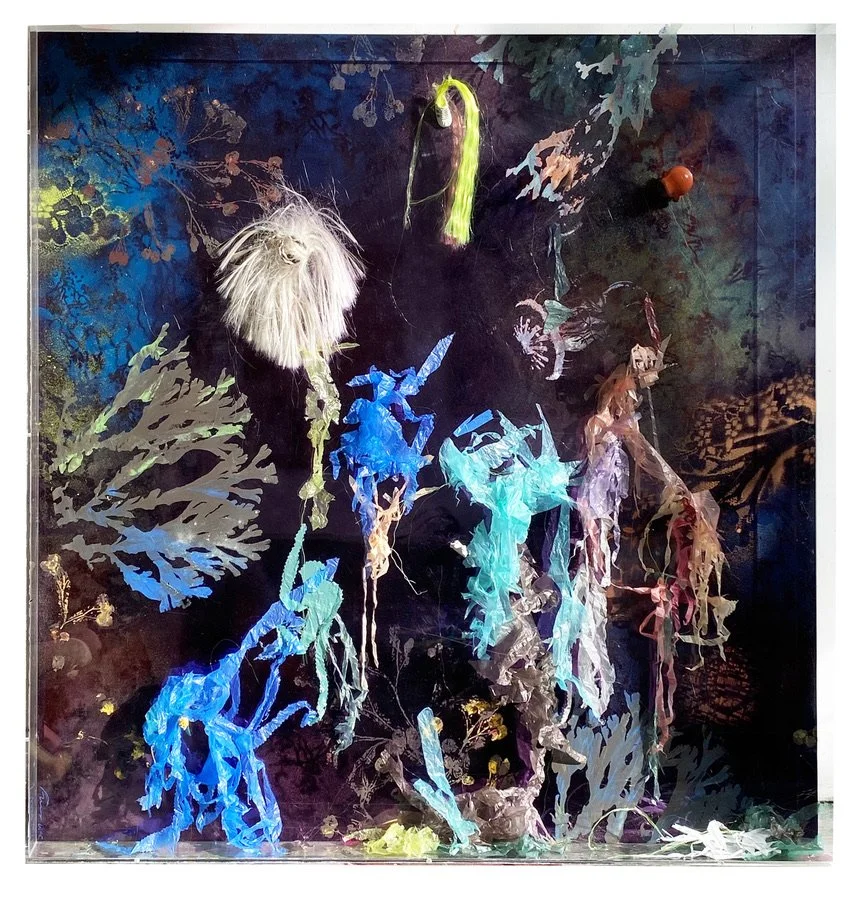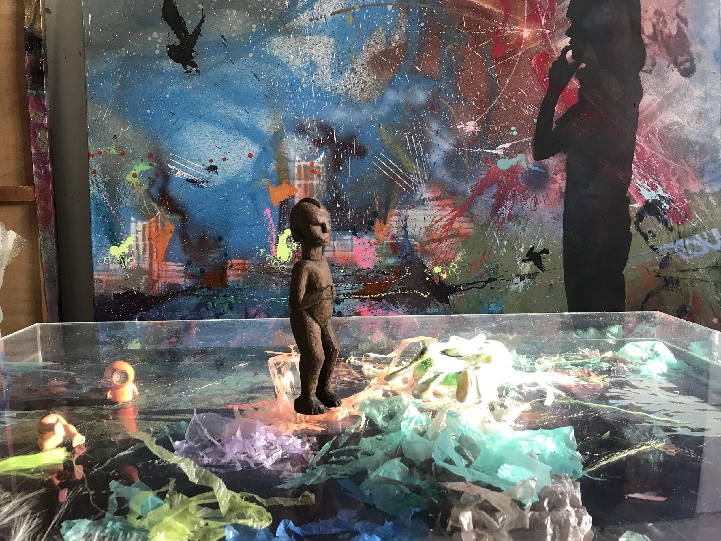 Barbie devenue Gorgone des mers redresse ses cheveux sous la main passée sur la surface de plexiglass qui contient l’oeuvre
